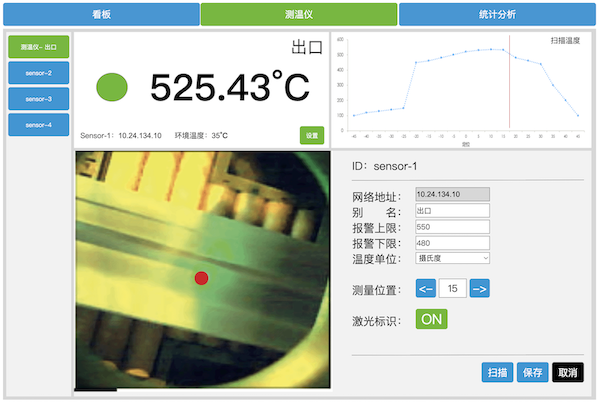 • 【智能自适应模式】支持测温点 “自动扫描”及“温区锁定测量”,启用这项功能后设备对整个测量范围进行移动扫描,然后自动将测温仪对准挤压工艺温度最高点(可设定),并在整个测量过程中自动移动测量位置以锁定温区。支持通过应用操作或外部命令可以触发此功能,还可在换模时从PLC自动触发此功能。该功能大幅提高型材测温精度并减小测温仪的对准难度,尤其适合多腔位成型的多束型材(一出多)的温度测量。