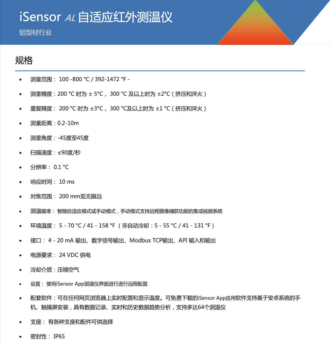 • iSensor AL支持多种测温场景及不同表面铝的测量,采用专利的自适应发射率算法,自动匹配最佳发射率,测量精度300 °C以上时可达到 ± 2°C超高精度。
